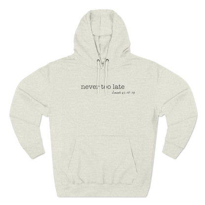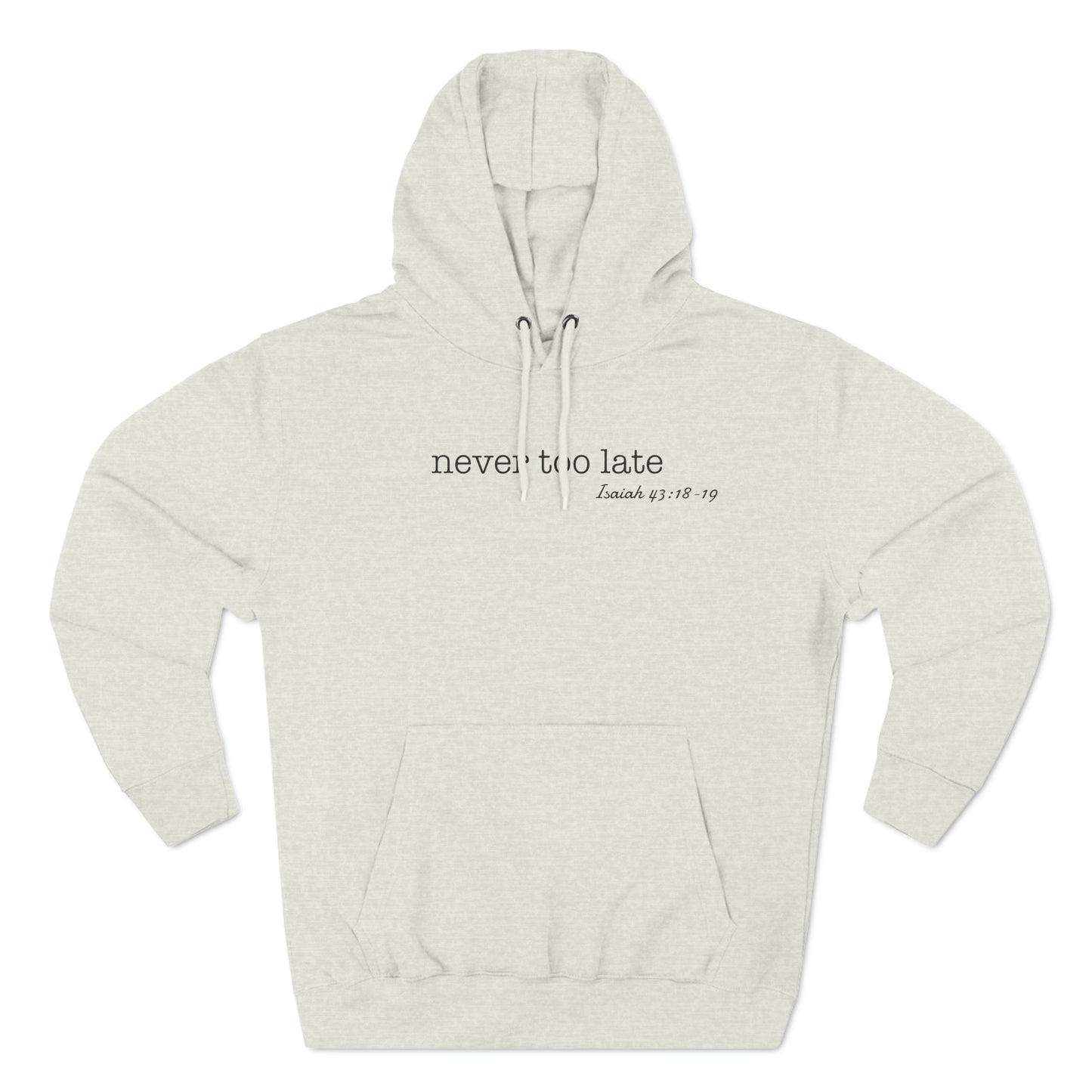 A cozy embrace of faith and style. Wrap yourself in warmth and inspiration with this meticulously designed fleece hoodie. Beyond being a garment, it's a testament to your unwavering commitment to your spiritual journey. Perfect for chilly days or cozy nights, our Never Too Late Men's Fleece Hoodie combines comfort and devotion seamlessly. Elevate your casual wardrobe with this unique blend, making every wear a meaningful expression of your faith. Made with three-panel fleece lining, this pullover is double stitched for durability and roomy. Pick one in your favorite color to match your style.